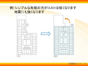 複雑な形状は工事費増の原因となり、逆にシンプルな形態は施工効率が高まり、耐震性の向上にもつながります。
