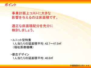 まず大きな影響を与えるのは床面積の設定です。ユニット型特別養護老人ホームの全国平均は42.7〜47.5㎡/人(福祉医療機構データ)ですが、都志デザインが手掛けた事例の平均は40.8㎡/人です。