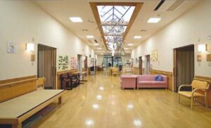 回遊性のある廊下やトップライトで明るいリビングがある環境は、入居者が自然に歩行訓練に取り組みやすい動線を生み出します。明るい空間は滞在時間も伸ばし、生活の質向上に寄与する可能性があります。